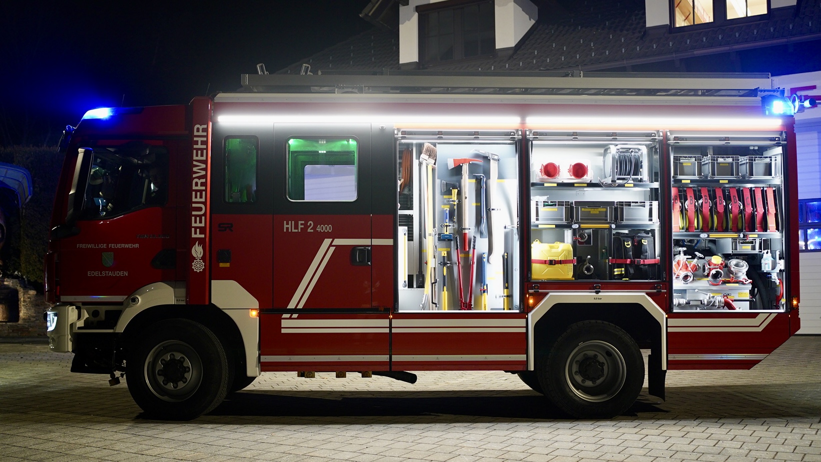 4000 Liter Wasser, Pumpe mit 3000l/min bei 10bar + 400l/min bei 40bar, Schaummittel-Schnellangriff, Straßenwaschanlage, LED-Umfeldbeleuchtung und Lichtmast, Hochleistungslüfter (elektrobetrieben), Stromerzeuger 14kVA, Atemschutz, dreiteilige Schiebeleiter, 360° Kamerasystem